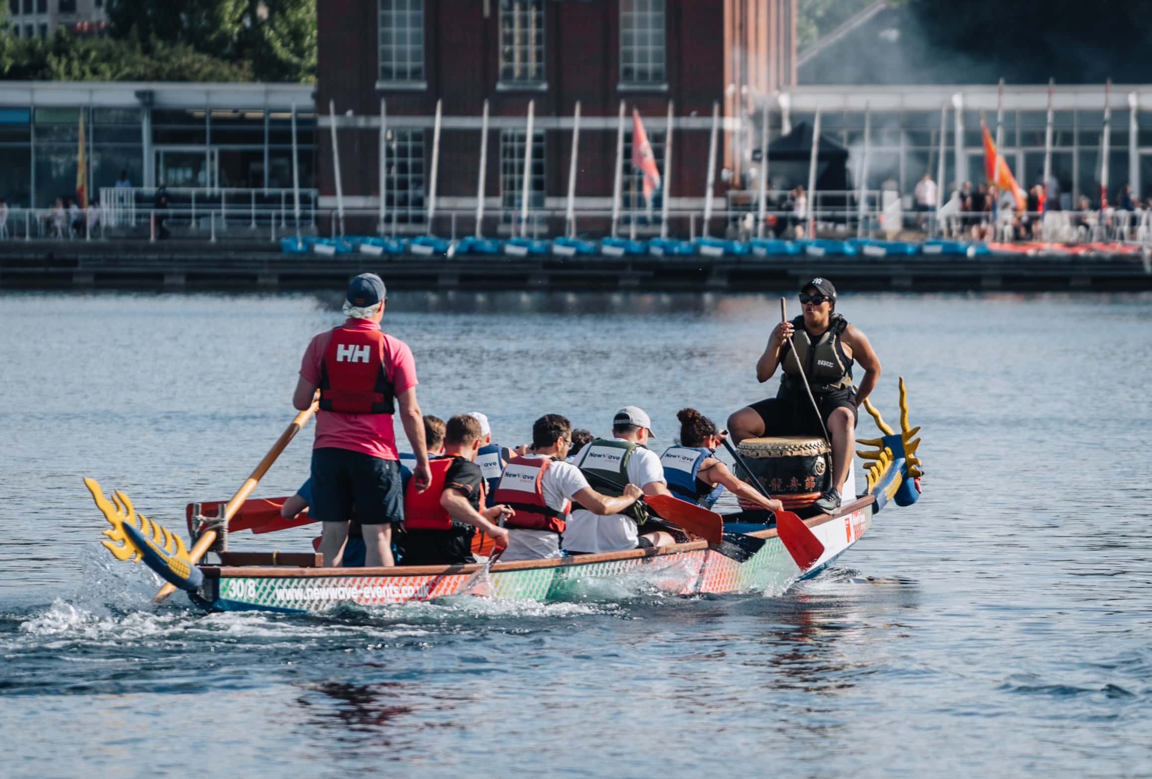 Dragon boat racing is rapidly gaining popularity in the UK. It’s not just fast; it’s also incredibly enjoyable. In each 30’ boat, up to 10 people paddle, led by a drummer at the front and a helmsman at the tail. No prior experience is necessary—just a lot of team spirit.